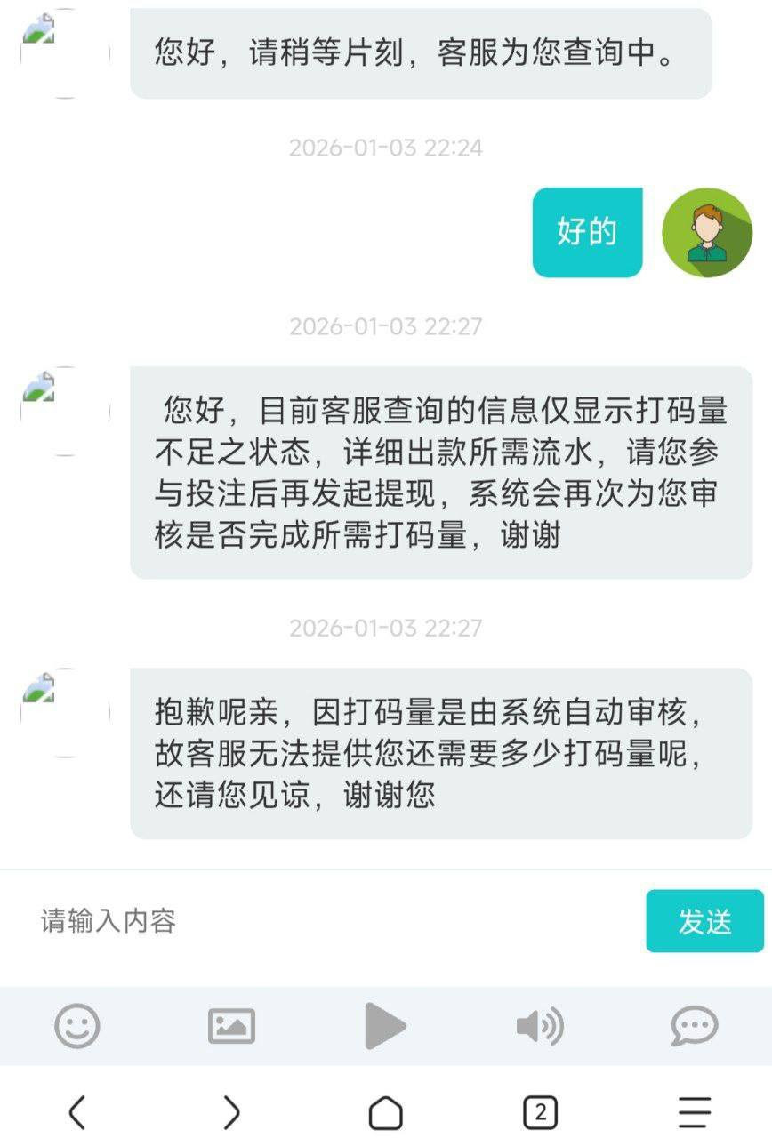 平台甩出一句:必须达到打码量,系统自动审核。问客服具体要多少?客服支支吾吾,就是死活不说清楚,摆明在拖时间。